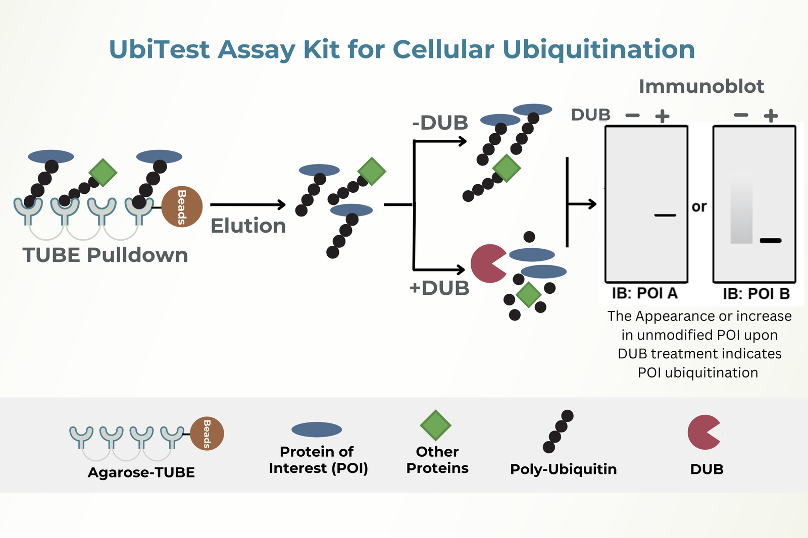 LifeSensors’ UbiTest is a medium-throughput platform for measuring the polyubiquitylation levels of protein(s) of interest (POI). UbiTest utilizes TUBE technology to enrich polyubiquitylated proteins. This fraction is analyzed by immunoblotting techniques with and without pan-selective DUB digestion. The appearance or increase in the intensity of the band corresponding to the POI indicates that the POI is polyubiquitylated in the studied condition. Identification of the type of ubiquitin linkage can provide insights into the cellular functions of E3s and substrates.