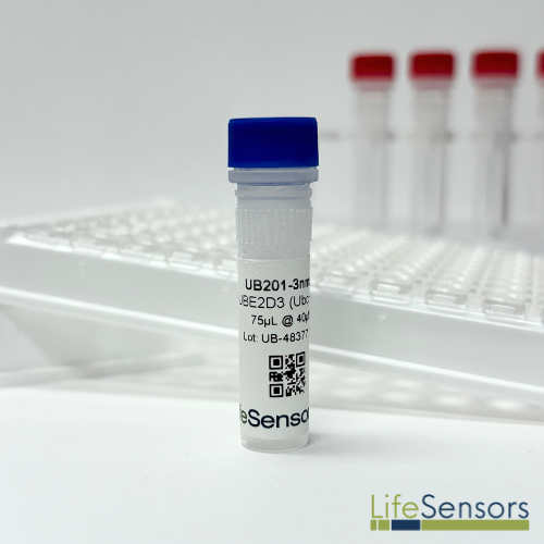 LifeSensors UB201 is UBE2D3 (UbcH5c), an E2 ubiquitin-conjugating enzyme used in ubiquitination research, supplied at 40 µM concentration for protein regulation studies.